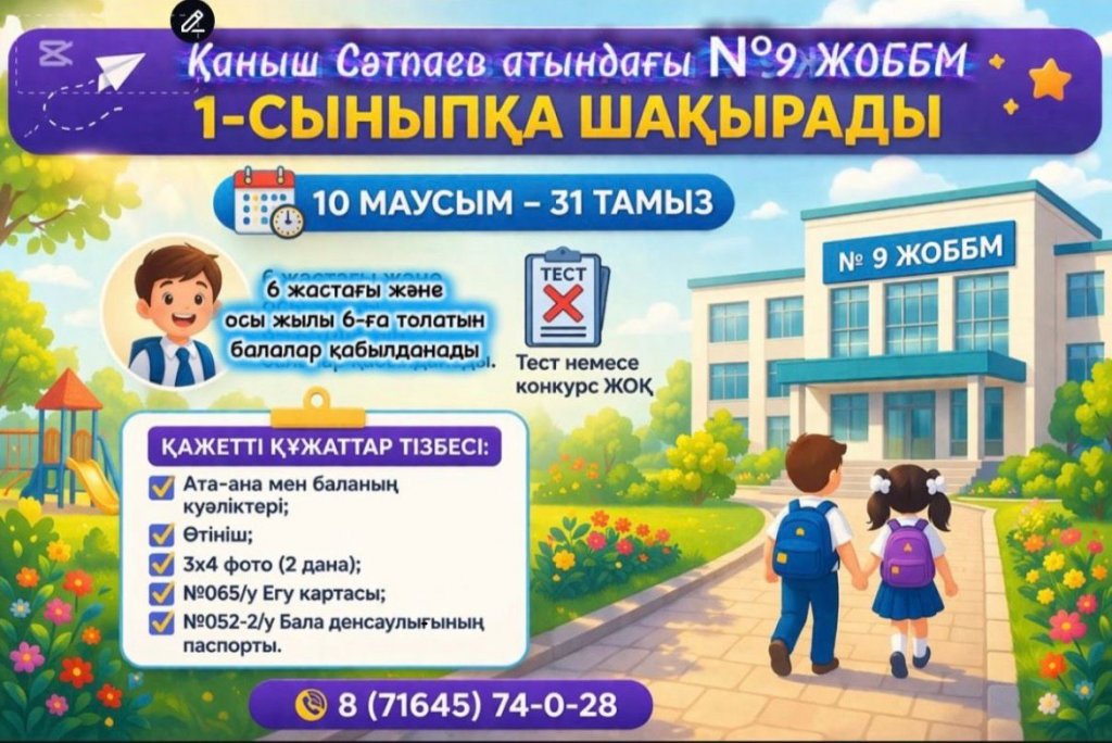 Степногорск қаласы ның Қаныш Сәтпаев атындағы 9 ЖОББМ 2026-2027 оқу жылына 1-сыныпқа оқушыларды қабылдау ағымдағы жылдың 10 маусымы мен 31 тамыз аралығында жүзеге асырады.